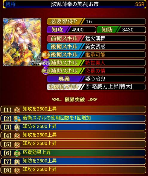 スキルの効果は 槍 は足軽・長槍足軽・武士・国人衆 弓 は弓足軽・長弓兵・弓騎馬・海賊衆 馬 は騎馬兵・精鋭騎馬・赤備え・母衣衆 器 は破城鎚・攻城櫓・穴太衆・大筒兵 砲 は鉄砲足軽・騎馬鉄砲・焙烙火矢・雑賀衆 鉄 は鉄砲. 美しい戦国キャラクターと、対人戦での戦略が魅力の 戦争シミュレーションゲーム 「戦国布武 我が天下戦国編」! 今回は、戦国大名でも主に東方面で活躍した、 北条氏康・真田幸村・猿飛佐助についてご紹介しま. 攻撃+下げスキルの下げ幅はイマイチ不明確ですね。 下げ計略では発動補助スキルの数が下げ幅に関係しているようです。 個人的な見解としては、ステ×スキルの下げ係数×発動補助係数みたいな感じかなと思いますが、検証した訳でも無いので確証はあり.