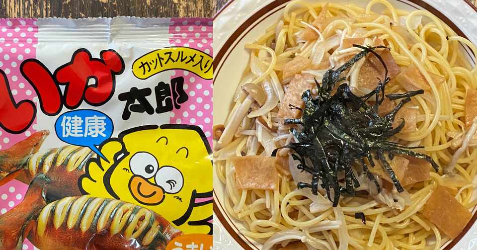駄菓子アレンジレシピ和風いか太郎きのこスパゲティ 鳩 頭巾 Note